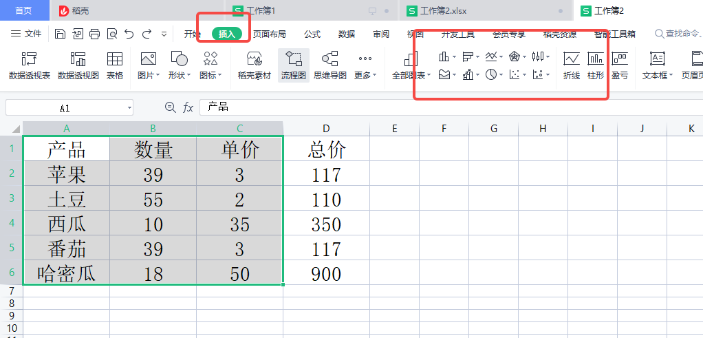 2、点击顶部的插入,在图表选项,点击想要制作的图表下拉图标,选择需要的图表样式,点击即可插入