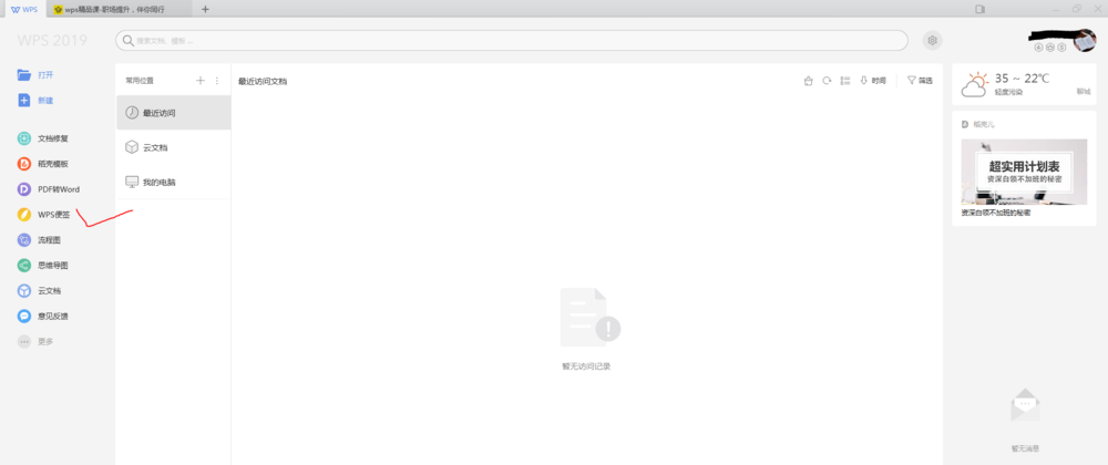 1、启动WPS,“新建”窗口中找到“wps便签”选项。