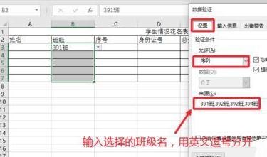 3、这时候打开的数据验证窗口中,我们设置里面选择验证条件为序列,然后下方输入你希望选择的班级类别,记住这里一定要用英文下的逗号,分开各个选项,最后点击确定按钮,设置完成。