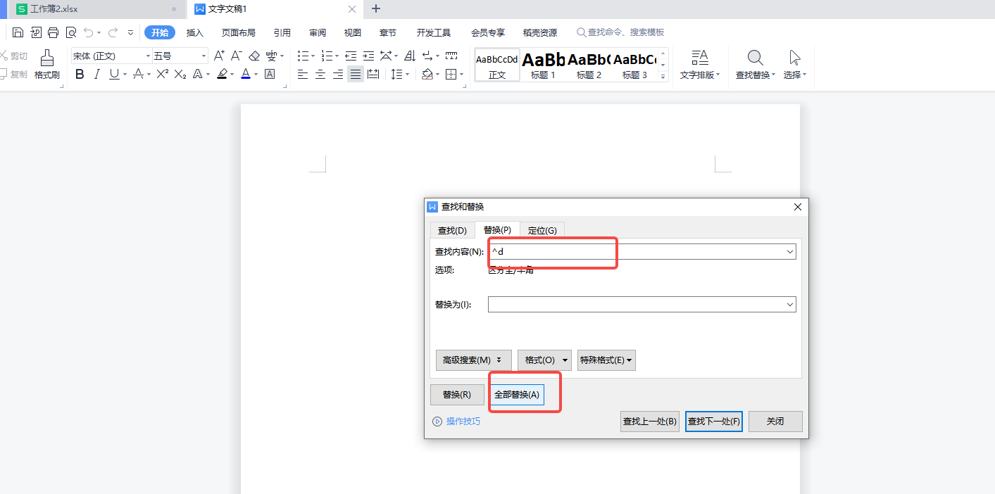 此时“查找内容”文本框将出现^d符号,保持“替换为”文本框留空,点击“全部替换”按钮即可。