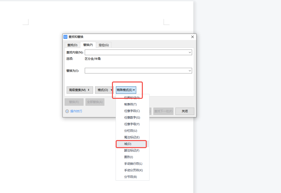 点击“特殊格式”按钮,点击列表中的“域”一栏。