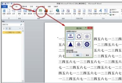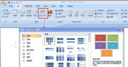 步骤一:打开WORD2007文档窗口,点击“插入”——“SmartArt”按钮,弹出SmartArt图表。