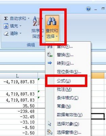 2、比较关键的一步,点击查找和选择--公式。大家可以看到,带有公式的单元格都已经被选中。