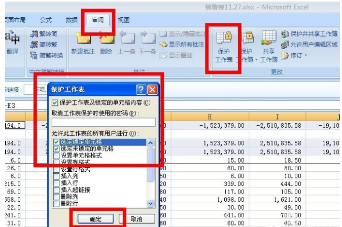 5、点击审阅--保护工作表--确定,此时跳出保护工作表的对话框,可以在密码中输入密码或根据自己的需要在相对的选项目前打勾。此时,效果已经出来了,带公式的单元格已经被锁定,而其他单元格可以编辑。