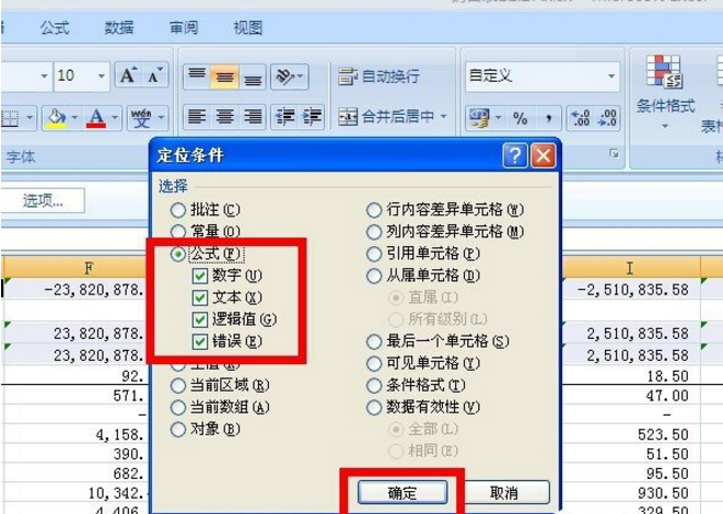 3、再次点击查找和选择--定位条件,跳出定位条件的对话框,点击公式,然后确定。