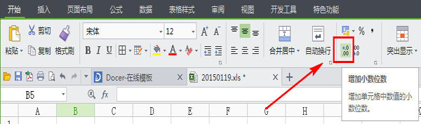 2、然后我们可以点击“开始”菜单,然后再我们工具栏上有这么一个按钮“增加小数位数”