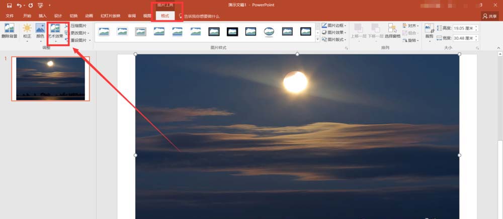 3、接着我们可以看到在上方“格式效果”的一栏下面,有个调整的小分栏,我们找到“艺术效果”