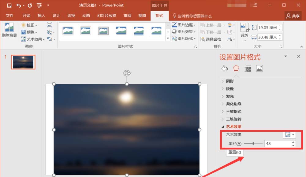 4、下拉“艺术效果”,我们进入“艺术效果的选项”中的“设置图片格式”的调整栏