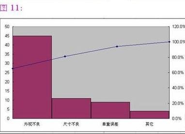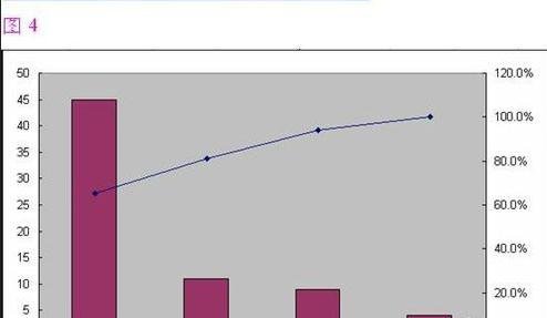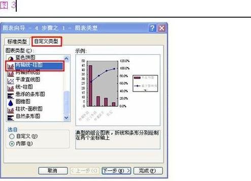 制作柏拉图步骤3:单击【插入】菜单下【图表】菜单项,弹出如图3所示对话框中单击【自定义类型】选项卡,选中【两轴线-柱图】,单击【完成】按钮,删除图例项后如图4所示。