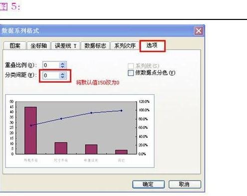 制作柏拉图步骤4:鼠标移到柱状图上右击一下,选中第一个下拉菜单项,出现如图5所示对话框,单击【选项】选项卡,将分类间距修改为0,单击【确定】按钮,如图6所示。