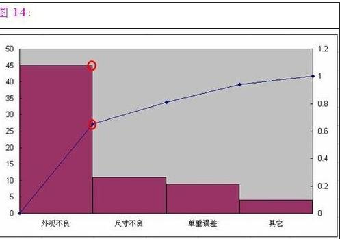 制作柏拉图步骤8:将右边纵轴刻度最大值改为1,再调节左边纵轴刻度最大值,使图14所示的两红点接近重合,显示折线图百分比数值,稍作修剪,最后成型如图15所示。