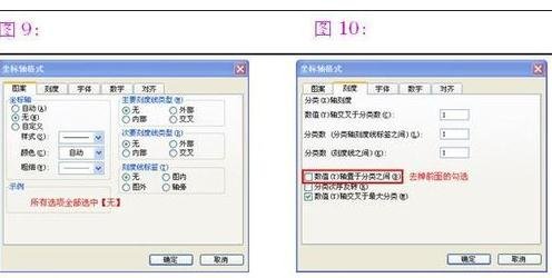 制作柏拉图步骤6:将鼠标移到上图红色框内右击一下,弹出如图9所示对话框,把【图案】选项卡上所有选项全部选中为【无】,再单击【刻度】选项卡,如图10所示,去掉红色框内勾选,单击【确定】后如图11所示。