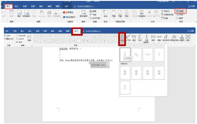 当然,Word里还有另外的办法录入分数。点击插入-公式-π,在设计里点击分式,会出现很多分式的样式。