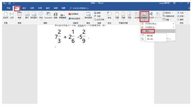 如果熟悉了域代码的格式后,快捷方式更为方便。按Ctrl + F9,插入域并填入表达式EQ 7F(2,3) + 2F(1,6) -5F(2,9),按Shift + F9将域转换成算式。