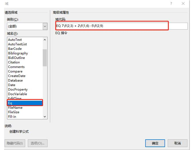 F(,)指创建在分数线上下居中的分数。所以域代码里填入“ EQ 7F(2,3) + 2F(1,6) -5F(2,9)”。