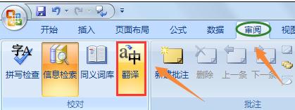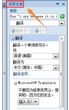 在审阅栏下我们可以看到"翻译"选项,点击之后就会在表格的右侧弹出一个信息检索的窗口,如下图;