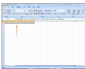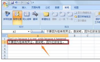 首先,打开excel表格,然后输入某段英文或者其他语种,如图;然后在工具栏将默认的"开始"切换至"审阅"。