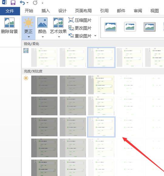 4、“调整”组中点“更正”按钮,在弹出下拉菜单的“亮度/对比度”栏中选择需要调整的对比度和亮度的设定值。