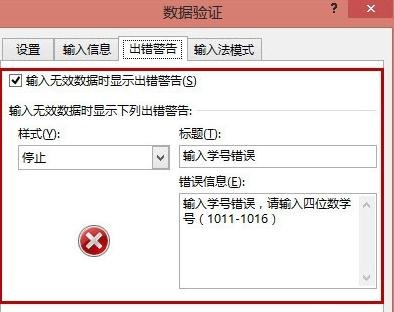 查询步骤6:再分别在“输入信息”和“出错警告”选项卡,输入相关信息如下图所示。输入完成后点击“确定”即可。