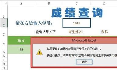 查询步骤14:保护Sheet1工作表(4):完成看看效果,在除了输入学号那个单元格可以输入信息外,其他单元格输入均有下图所示提示信息。
