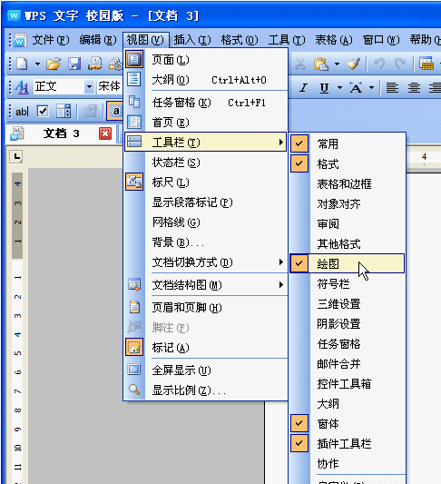 1、田字格的外框是一个正方形,我们需要使用绘图工具中的矩形来制作。绘图工具栏默认是开启的,如果被关闭了,可以通过菜单“视图—工具栏—绘图”,启用绘图工具栏