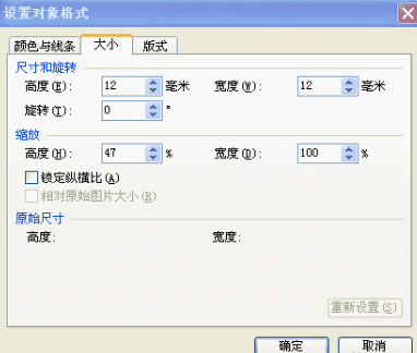 3、选择刚才插入的矩形,单击鼠标右键,设置对象格式,也可以击图形,边会弹出设置对象格式对话框,将图形的高和宽都设置为12毫米,并将图形的填充色设置为无填充色
