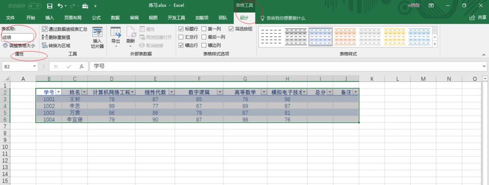 4、选中表格任意单元格,如图所示。选择"表格工具→设计→属性"功能区,表名称文本框将默认的"表 1"修改为"成绩"。