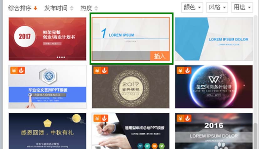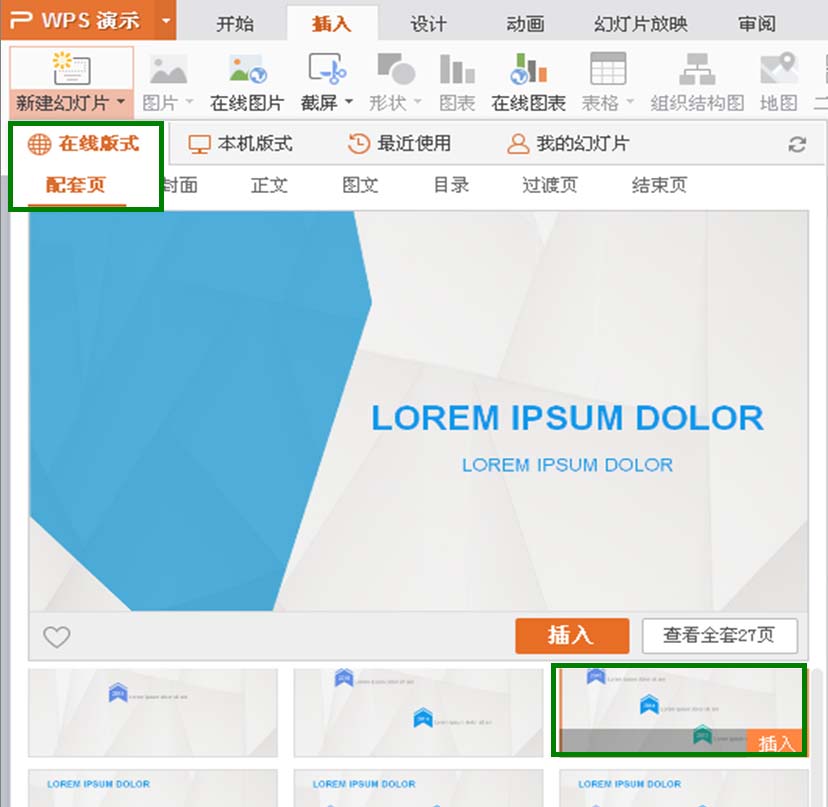 4、如果选择在线模板,先点击在线版式,然后拖动下方右侧的鼠标柱,选择免费得在线模板,然后点击“插入”,这套模板的正文第一页就会自动出现在wps中。