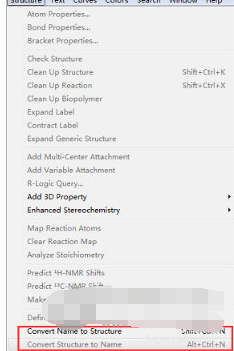3、从ChemDraw绘制窗口的Structure菜单下,根据需要选择Convert Name to Structure(由命名转换为结构式)和Convert Structure to Name(由结构式转换为命名)命令。