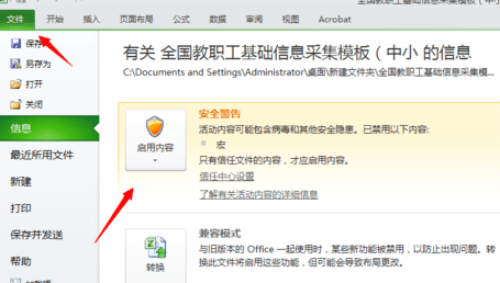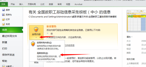 如果直接点击启用宏,以后就会被直接启用,如果不希望打开其他的文件时被启用,可以点击宏已被启用的链接,也可以点文件,就会看到信息里有提示【启用内容】。