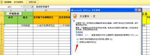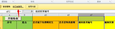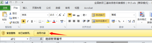 打开excel文件,就看到黄色的提示,是一个安全警告。提示宏已经被禁用,这样这个文件使用就有限制了。