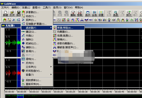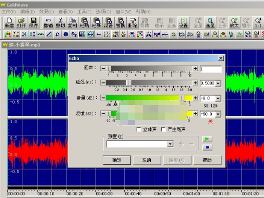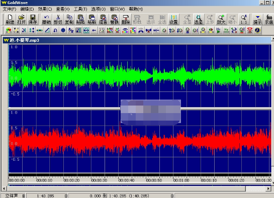 我们打开的是一个立体声文件,所以GoldWave会分别显示两个声道的波形,绿色部分代表左声道,红色部分代表右声道