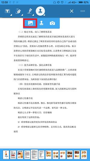 4、在上方会出现5个功能,因为我们是添加图片。所以翻到你要添加图片的那一页,点击软件界面上方的第五个功能,会进入手机图片库,选中你要添加的图片并点击,就将图片添加进PDF文档啦!