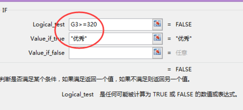 之后在第一个框里用鼠标点击前面统计出来的第一个总分然后再限定一个范围,如图的G3>=320。第二个框里写上你要评论的等级,比如优秀,合格,良好什么的。