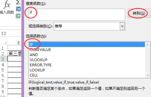在点击插入函数之前得先把光标停在‘总评’那一列里。之后在‘插入函数’选项里面的第一个框里输入"if",再点击‘转到’之后点击确认。