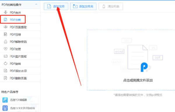 第二步,点击【添加文件】按钮,把需要进行拆分的PDF文档添加进来。