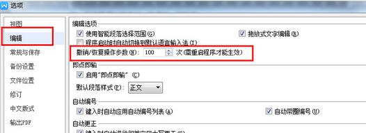 4、进入选项后点击工具栏的“编辑”,然后找到“撤销/恢复操作步数”我们可以对步数进行修改,修完完毕后点击确认即可。需要注意的是需要重启WPS程序才能生效。