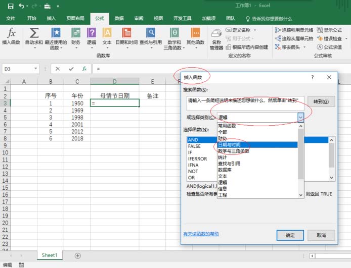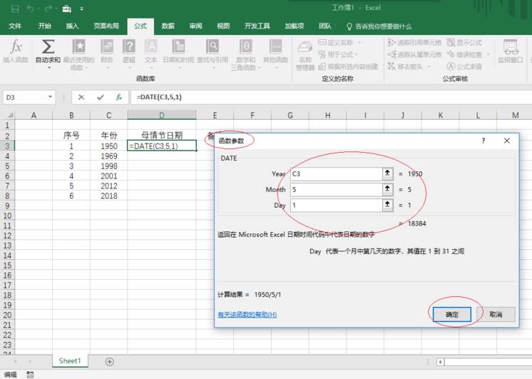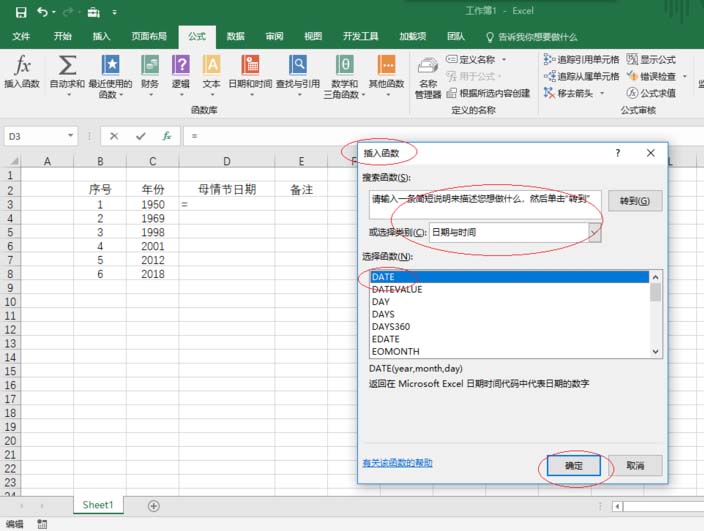 4、如图所示,选择函数列表框选择DATE函数。设置完成点击"确定"按钮,下步进行推算指定年份母亲节日期的操作。