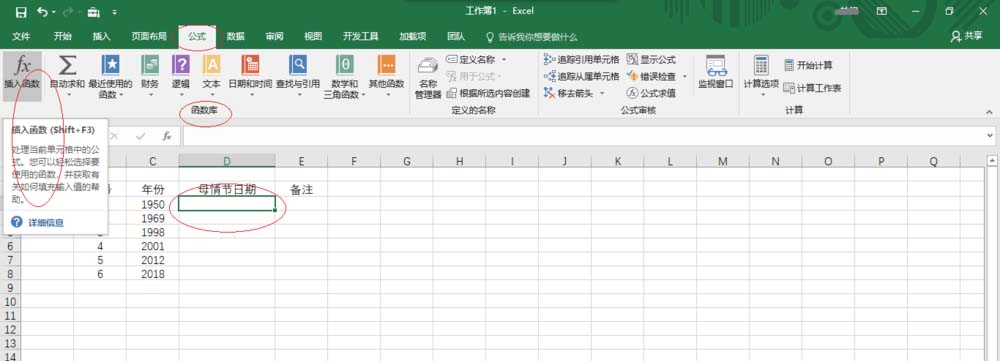 2、母亲节为每年5月份的第二个星期日,本例要求用函数推算母亲节具体日期。点击"公式→函数库→插入函数"图标,如图所示。