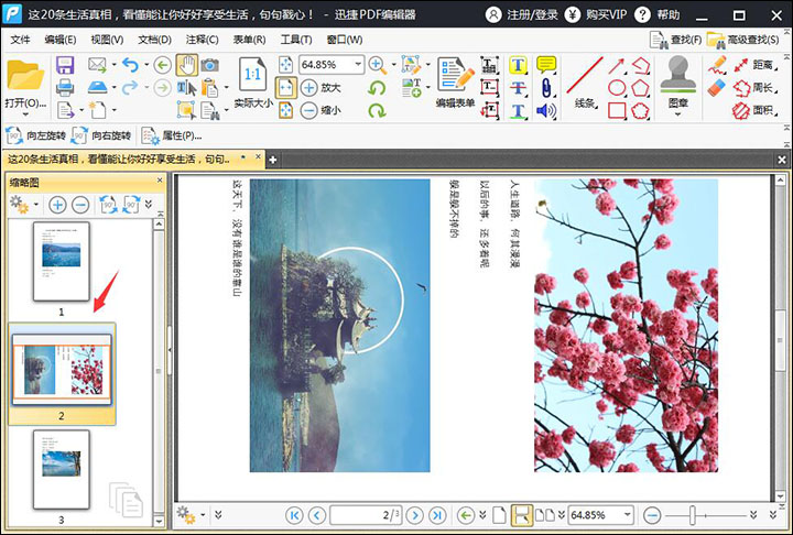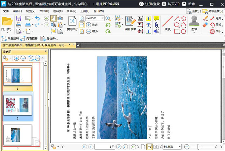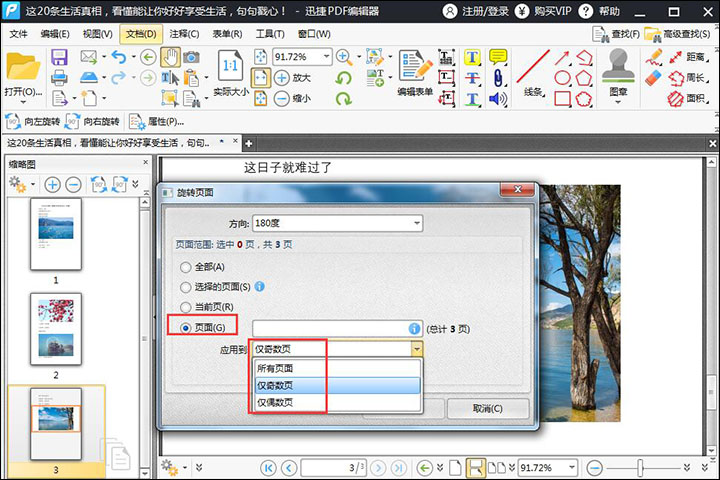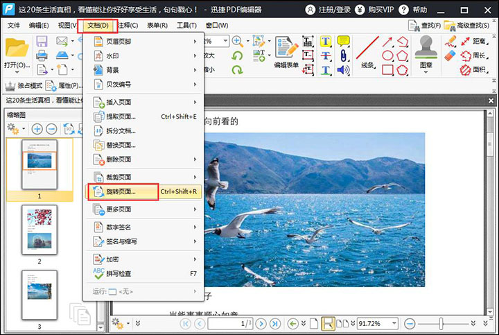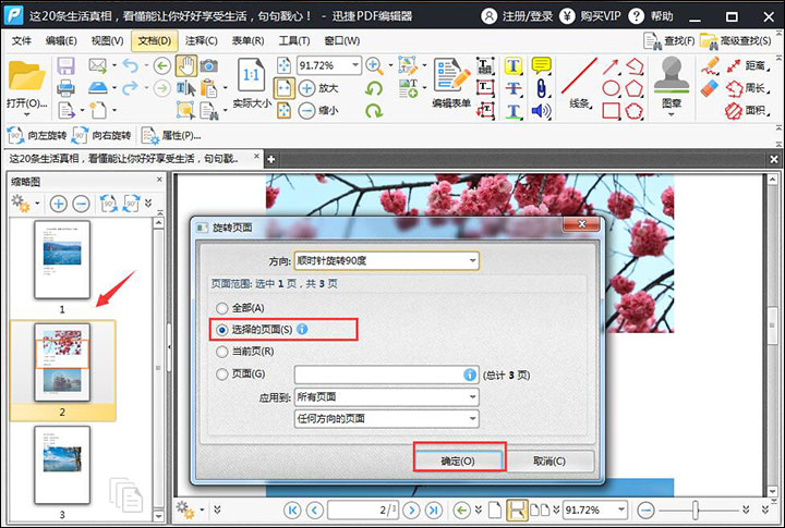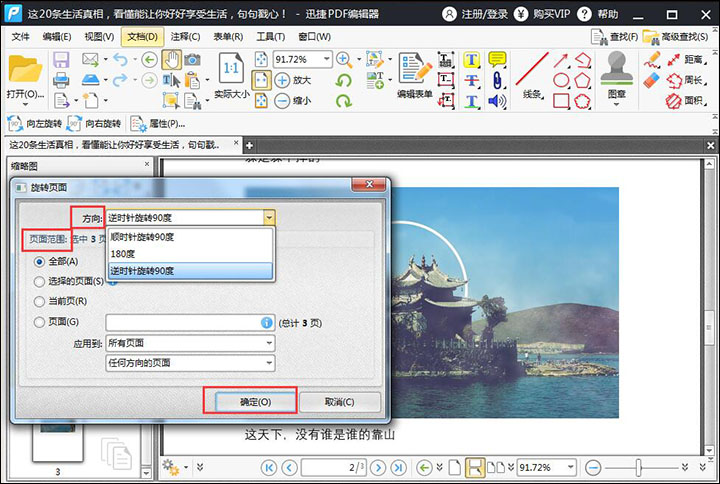 【一】在缩略图中选中需要旋转的页面,然后点击“文档”选择下面的“旋转页面”,选择好之后就可以对方向进行设置,设置好之后点击“确定”即可。