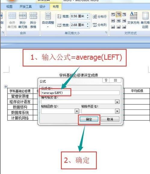 步骤四:计算第二个单元格的平均成绩,定位光标/布局/公式