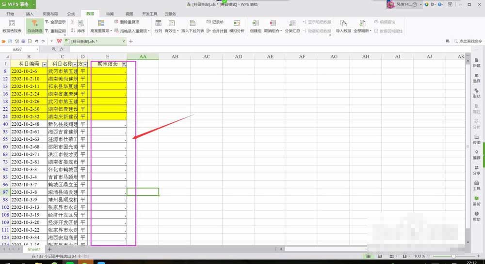 3、鼠标移至E列,单击右下角的倒三角形,如下图所示: