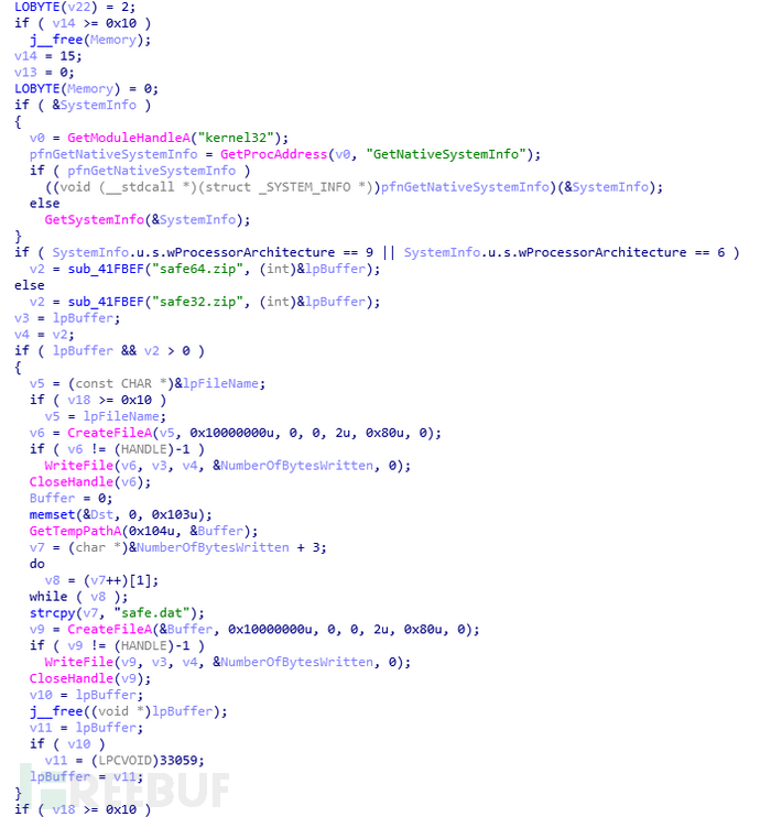 c.根据系统版本数位不同,释放safe32.dat或者safe64.dat命名为safe.zip,并将文件生成到”%temp%”和C:\ProgramFiles\Common