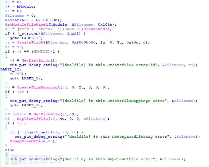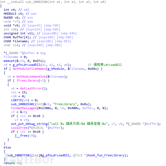 自身DLLMAIN被调用后,接下来木马会尝试对LdrLoadDll函数进行 inline Hook,如果LdrLoadDll函数地址获取不成功,则获取LoadLibraryW函数的地址进行inline Hook,作者的目的是为了让自己运行在当前进程内存中,并卸载当前进程的自身模块,不让分析人员发现有可疑DLL的存在。