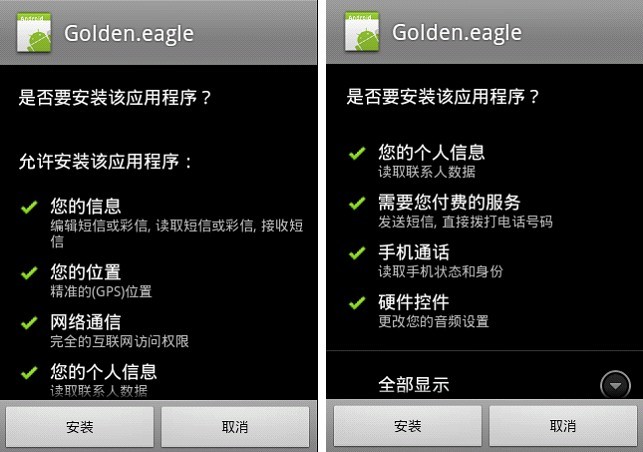 摘要:8月26日,金山安全中心捕获目前最强悍的手机窃听后门病毒"金雕"(英文名Android.Hack.GoldenEge)。"金雕"后门安装到Android手机后可窃听短信、通话记录,再将窃听痕迹打扫干净。金山手机病毒分析师称,"金雕"后门病毒设计精巧,令人瞠目。