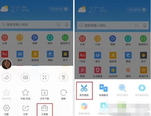 2、现在,点开QQ浏览器下方的“设置”会看到一个“工具箱”,点击工具箱,第一个小剪刀——网页截图,神器就在这里。