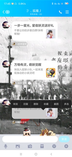 2、会弹出一个聊天的窗口,在这里你可以看到转发、回复以及删除、收藏以及截图等,选择截图;