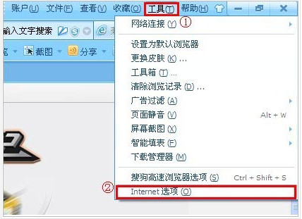 第一步:和清理缓存一样,在浏览器的工具栏找到“工具”,然后点击“Internet选项”