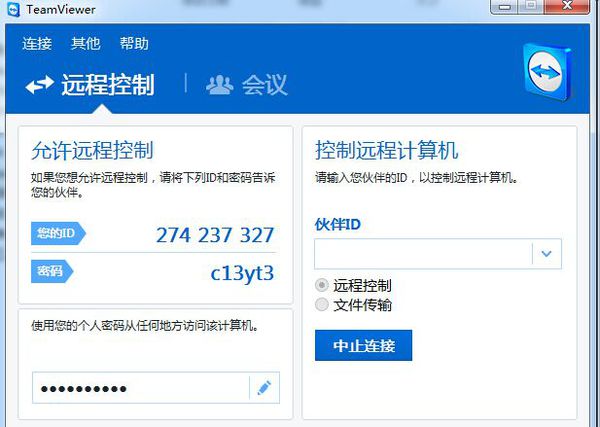 2、下载完成后安装该软件,保持双方的电脑都联网并且都打开了TeamViewer软件,若一台电脑要连接另一台电脑,则在另一台电脑中找到ID号和密码。