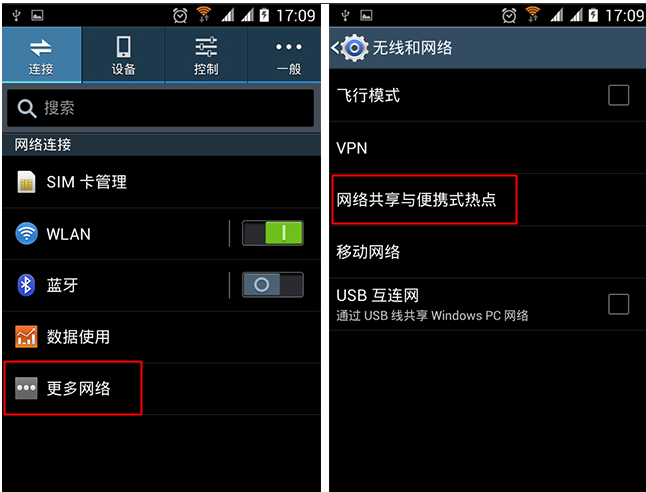 2、接下来打开手机的网络连接,选择“更多网络”,点击“网络共享与便携热点”,